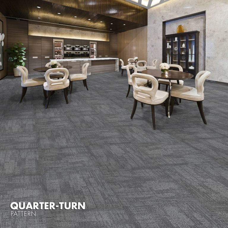 EuroBac™ backing ensures Harbor carpet tiles remain stable and easy to install without PVC. Measuring 23.6 in. x 23.6 in., each carton covers 54.27 sq. ft. and allows for creative installation patterns such as Ashlar, Monolithic, or Quarter-Turn.